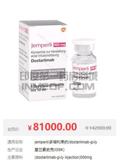 多塔利单抗一盒的规格500mg/10ml/支,印度第一药房价格是81000元。