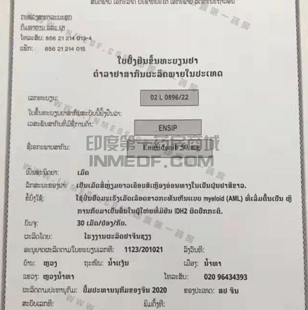 enasidenib恩西地平已被FDA批准作为单药治疗具有易感IHD2的R/R AML突变,虽然以往的许多药物都是来自印度,但是ENSIP是在老挝上市后的商品名,来自老挝南塔制药,具体审核文件如下所示;