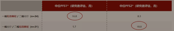厄洛替尼不论在哪个阶段,都显示出比化疗更好,一线厄洛替尼二线治疗组的中位PFS1(从随机访问到确保研究到一线治疗疾病进展)和中位PFS2(从一线疾病进展到二线治疗疾病进展)分别为16.8个月和8.3个月,而一线厄洛替尼二线治疗组的PFS1和PFS2分别为5.7个月和18个月(见图)。表明厄洛替尼的疗效优于化疗。