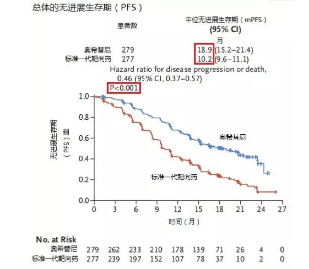 中位无进展生存时间:奥希替尼18.9个月,标准疗法10.2个月,提高了整整8.7个月。