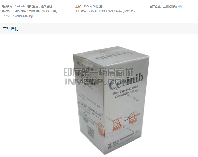 色瑞替尼最常见的规格为150mg每粒,来自孟加拉耀品国际版色瑞替尼同样也是如此,患者每日需要口服三粒,如果因为副作用,对于剂量是可以进行适当调整的,患者为了购买来自孟加拉的Cerinib也是找寻了许多渠道,目前最为方便的是,从印度第一药房进行购买。