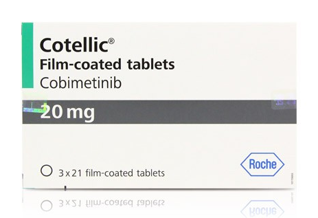 考比替尼(商品名:Cotellic)与威罗菲尼一起被批准用于治疗患有BRAF V600突变的晚期(即转移性或不可切除的)黑色素瘤的成人,考比替尼联用优势特别是在整体生存方面,延长了患者生存期。