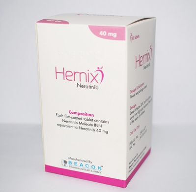 来那替尼相关临床试验数据:1。可拓试验:用于早期手术后曲妥珠单抗辅助化疗后的长期维持治疗。与安慰剂组相比,来那替尼的2年无病生存率为94.2%,而安慰剂组为91.9%。2.SUMMIT试验:评估来那替尼对141例不同类型肿瘤的疗效。结果表明,乳腺癌治疗最有希望,ORR为32%。在胆道癌和宫颈癌中,ORR分别为22%和20%。