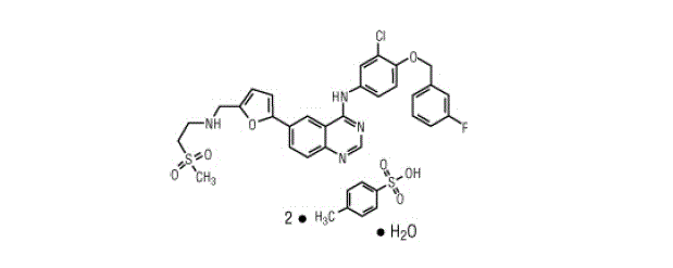 拉帕替尼是一种小分子,是4-苯胺基喹唑啉类激酶抑制剂的成员。它以二甲苯磺酸盐的一水合物形式存在,化学名称为N-(3-氯-4-{[((三氟苯基)甲基]氧基}苯基)-6-[5-({[2-(甲基磺酰基)乙基]氨基}甲基)-2-呋喃基]-4喹唑啉胺双(4-甲基苯磺酸盐)一水合物。其分子式为C29H26ClFN4O4S(C7H8O3S)2H2O,分子量为943.5。拉帕替尼二甲苯磺酸盐一水合物具有以下化学结构: