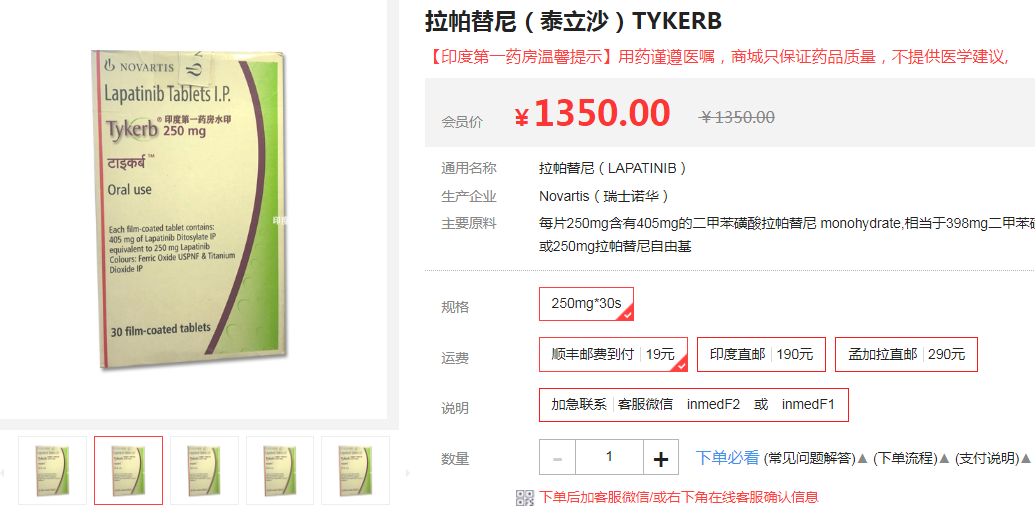 这个时候也有其它一种选购摆在面前,也是印度版拉帕替尼。印度版拉帕替尼是瑞士诺华出口到印度的,属于原研药,每盒只需要1350元(价格来源印度第一药房)。面对如此低的价格,乳腺癌患者必然选择从印度购买Novartis(瑞士诺华)的拉帕替尼。