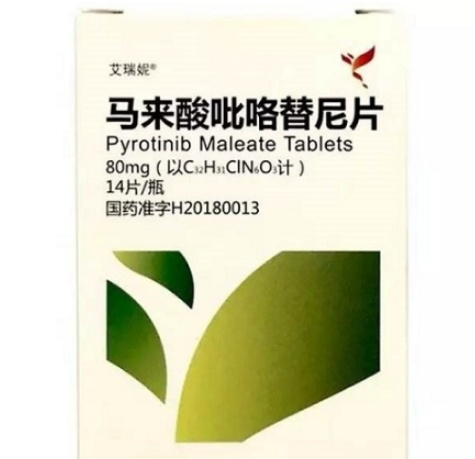 吡咯替尼于2018年8月基于一项包括128例既往接受过或未接受过赫赛汀治疗的复发或转移性乳腺癌患者的 II 期临床试验获得国家药品监督管理局有条件上市批准。适应症为:联合卡培他滨,用于治疗 HER2 阳性,既往未接受或接受过赫赛汀的复发或转移性乳腺癌患者,使用本品前患者应接受过蒽环类或紫杉类化疗。