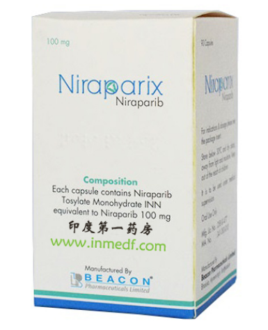 尼拉帕尼是一种口服多聚腺苷二磷酸核糖聚合酶(PARP)抑制剂,可抑制细胞修复DNA损伤。对于BRCA基因突变的癌细胞,如果PARP活性被进一步抑制,这些细胞在分裂时会产生大量的DNA损伤,导致癌细胞死亡。帕尔帕尼、奥拉帕尼和鲁卡帕尼获得美国食品和药物管理局批准,用于卵巢癌铂类化疗后的稳定期维持治疗,用于延长复发时间、改善生活治疗和延长生存时间。也可用于铂类耐药性的二线治疗。
