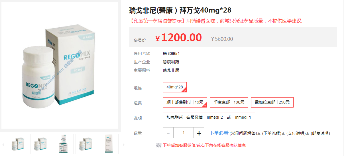 瑞戈非尼仿制药有孟加拉版本的吗?有的,并且在印度第一药房就可以购买到,价格为1200元,是碧康药企研制的,瑞戈非尼服用周期为28天,每日需要160mg。一个月就需要服用三盒,花费在3600元左右,这远远比原研药便宜很多,印度第一药房全线碧康产品均是由孟加拉碧康药厂直接发出,孟加拉直邮是需要患者提供病历或者诊断书才可发出,全程物流可查,到货周期在15天左右,这让患者购药放心了不少,有需要可以随时联系印度药房客服!