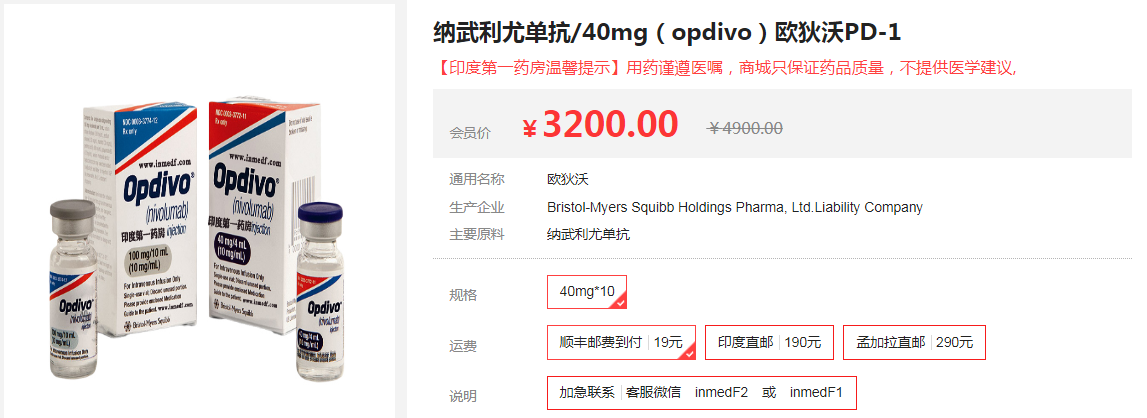 纳武利尤单抗被称为神药,是第一个在国内获批上市的PD-1免疫治疗药所以价格相对来说是比较昂贵的,在中国购买需要4591元(40mg/10ml),不同患者的注射剂量不一样,每个月患者需要花费好几万元,一年下来就是30万左右。在印度第一药房也可购买到纳武利尤单抗,价格为3200元,与国内相比还是能节省一笔钱,有需要的可以点击下方链接进行了解。