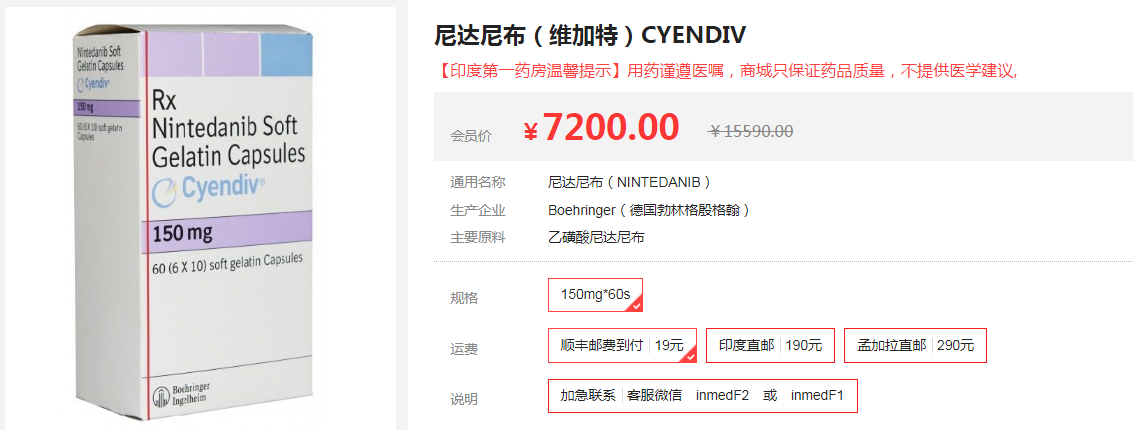 尼达尼布在国内预计一个月要花费2万左右,规格100毫克30粒每盒零售价11200元,一盒是半个月的量,一个月需要两盒,这个价格一般家庭是负担不起的,但是在印度购买尼达尼布就划算很多,是德国勃林格殷格翰出口到印度的原研药,只需要7200元一盒(150mg*60s)。一盒可以吃一个月,大大减轻了家庭负担,选择靠谱购买平台最重要,建议选择印度第一药房这种海外平台。药品有保障。