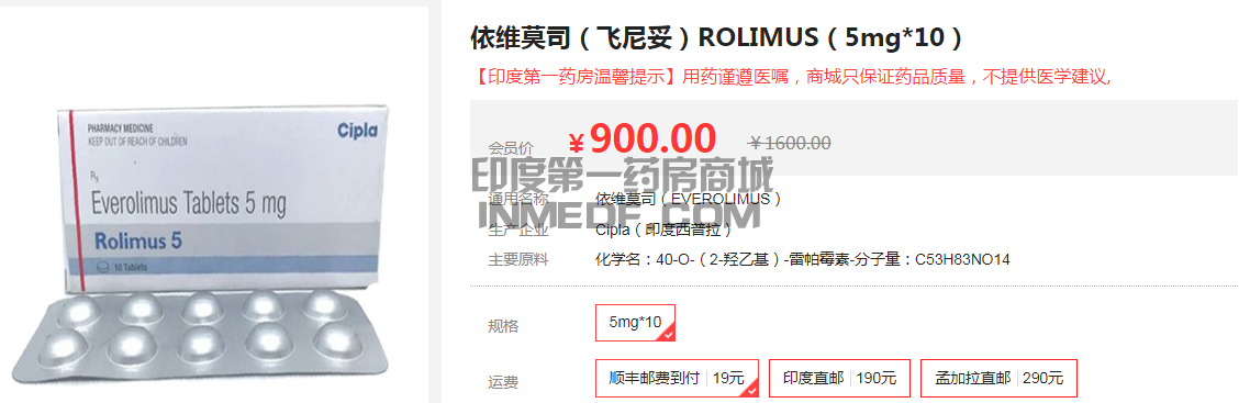 2017年依维莫司已经加入了中国医保行列,患者需要满足一定的报销条件才可以进行报销,这说明,不是人人都可以进行报销的,每个地方的政策都是不一样的,报销后的依维莫司价格约为4000元左右一盒,那么无法报销的患者,只能按原价进行购买,一个月下来无法承担费用怎么办呢?可以购买仿制药,印度是仿制药大国,依维莫司仿制药在印度也是经过政府批准生产的,印度西普拉药企的依维莫司只需要900元一盒(5mg*10),性价比极高。