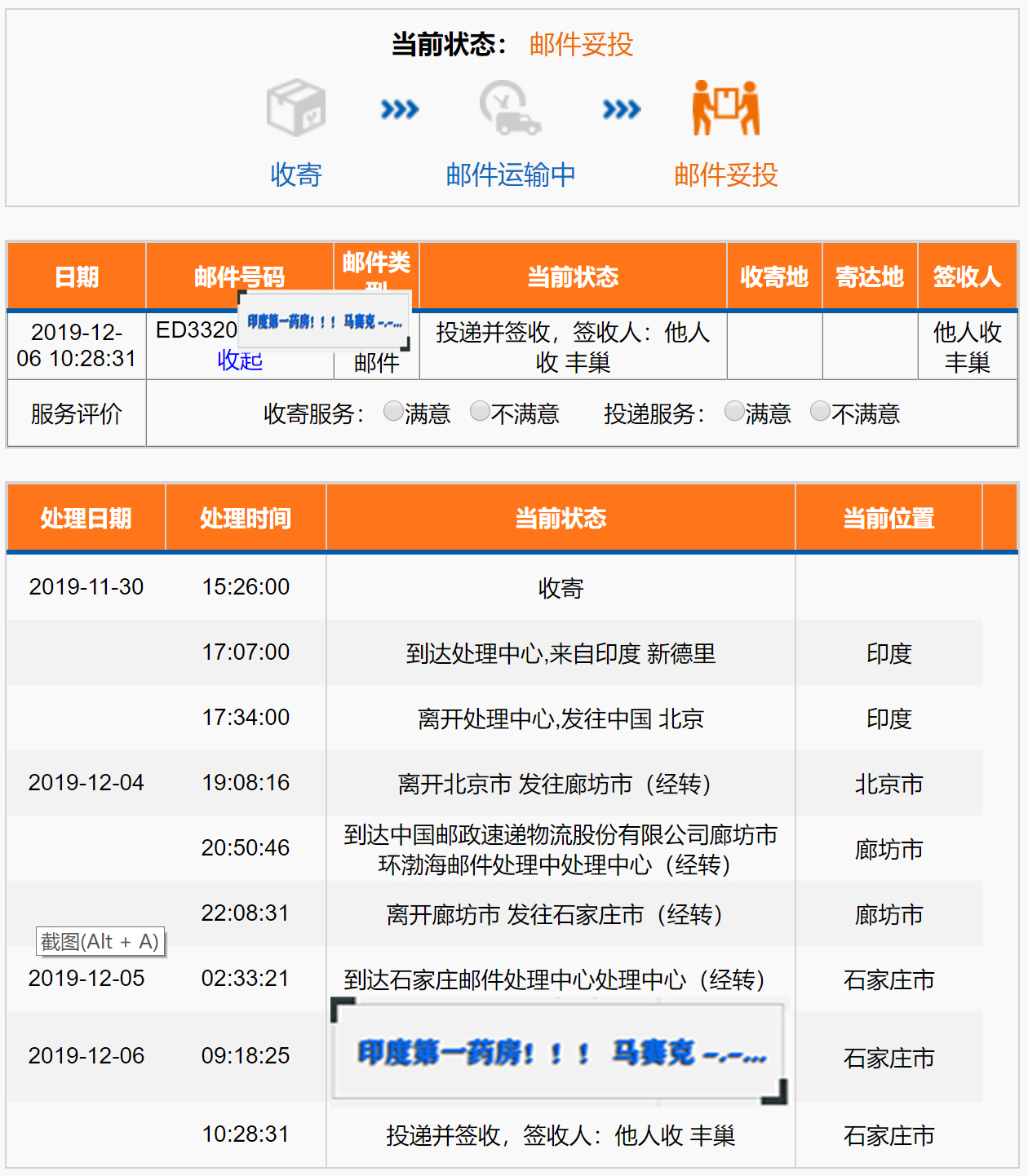 印度第一药房12月份订单流水记录直邮石家庄妥投物流信息载图...
